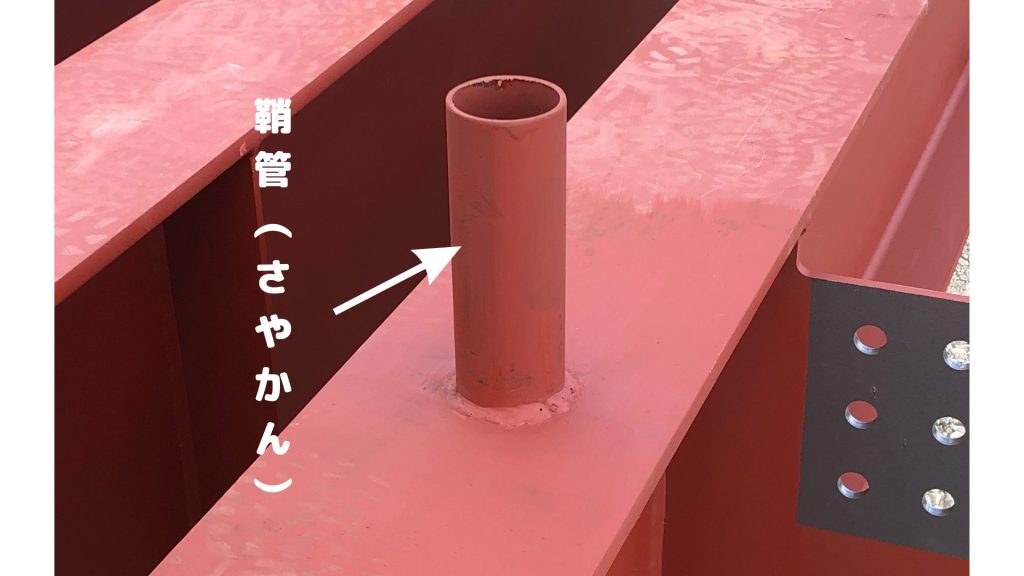 鉄骨工事で使用する鞘管は仮説手摺を取り付ける為に梁にあらかじめ付けておくソケットの役割をする丸パイプです。