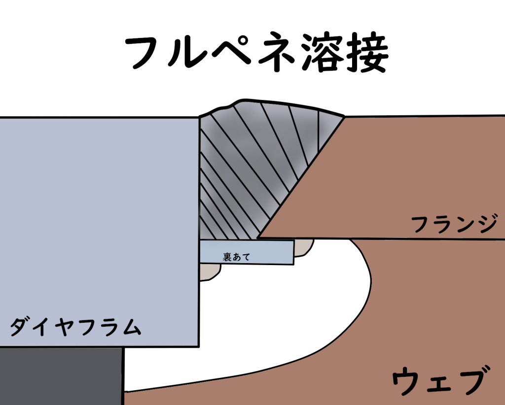 鉄骨工事において柱のベースプレートやダイヤフラムなどの溶接や仕口と呼ばれるH形鋼を接合するために柱から短い梁を出している部分にはフルペネ溶接が必要となります。