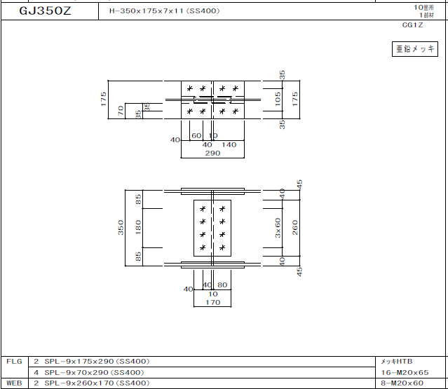 小梁などのガセットプレートも継手といい、ボルト数や孔ピッチが記載されています。